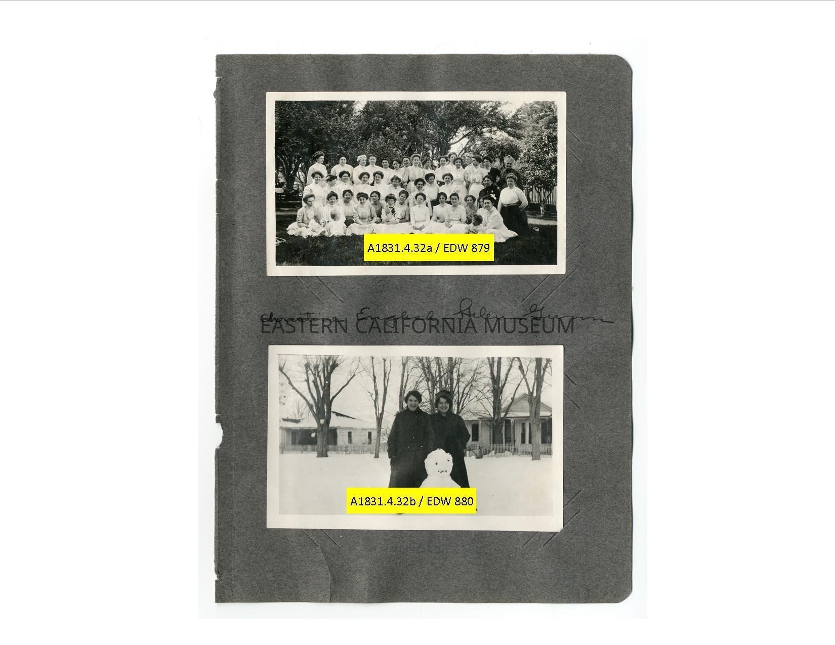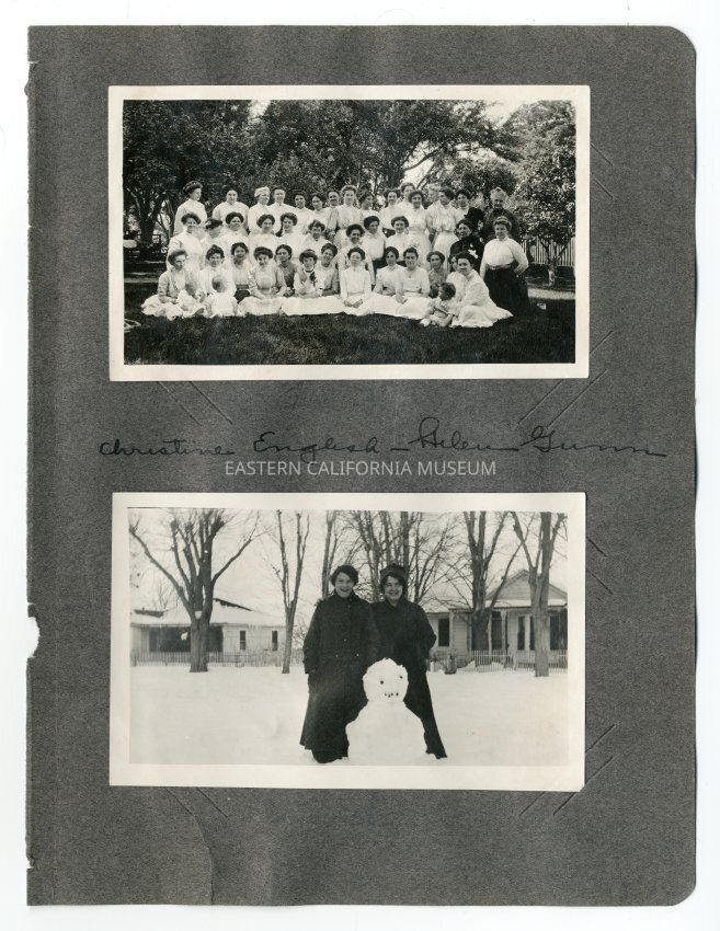 A1831.4.32b: Exterior photo of two young women posing with a short snowman. They are idnetified as Christine English and Helen Gunn. There are two houses in the background and lots of snow.Collection