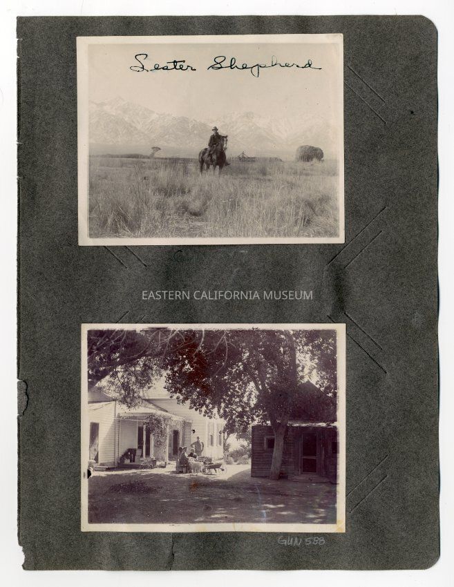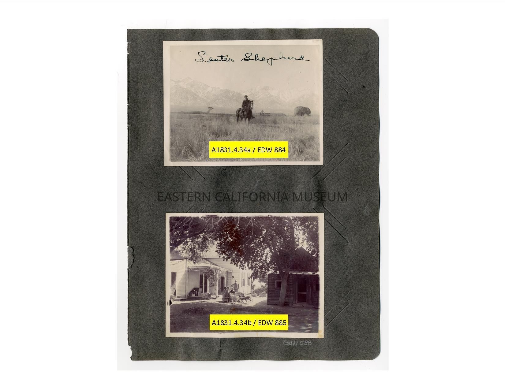 A1831.4.34a: Photo of a man on horseback with the Sierra Nevada mountain range in background. There is also a large pile of hay and what may be a corral behind him. He is identifed as Lester Shepherd. Loction may be Shepherd's Ranch near Georges Creek.
