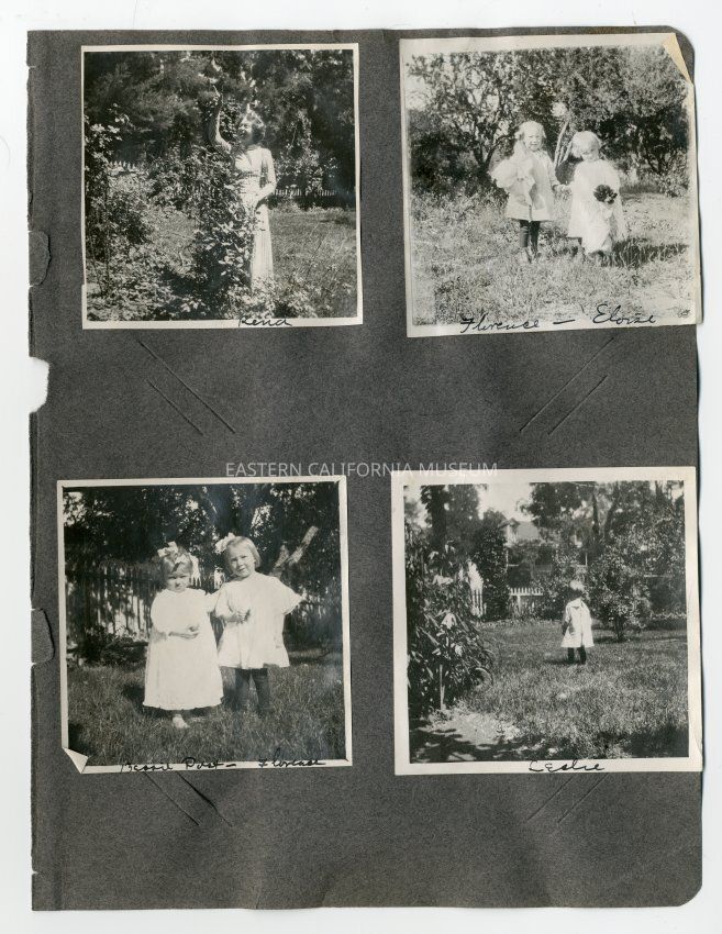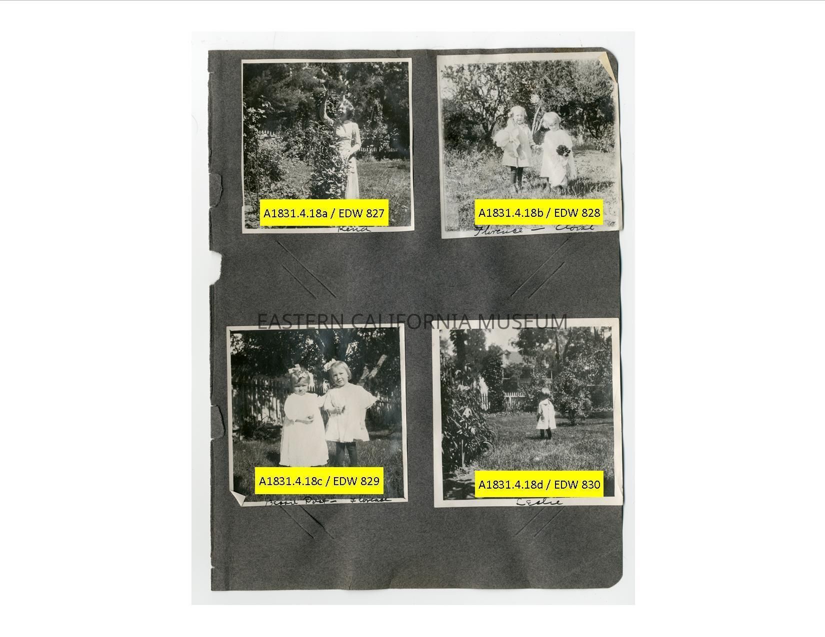 A1831.4.18c: Exterior photo of two toddlers standing on a grassy lawn. They are identified as Bessie Post and Florence.