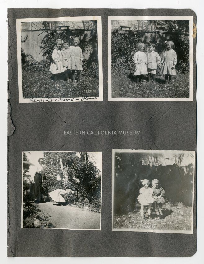 A1831.4.20b: Exterior photo of three children standing on a grassy lawn. They are identified as Eloise, Charles Merony, and Florence.