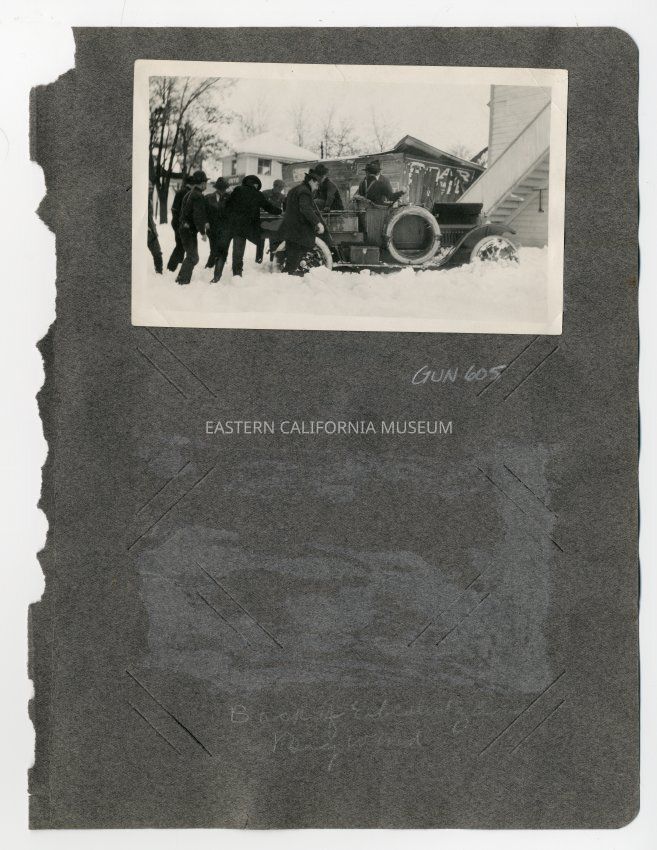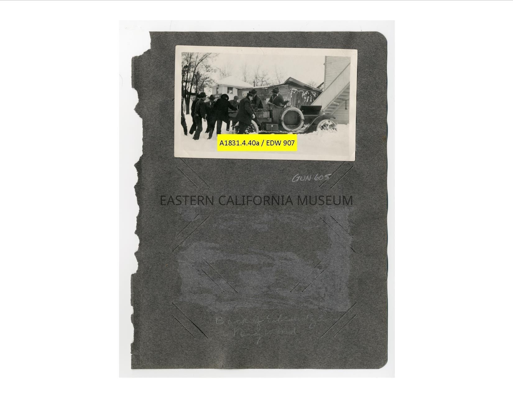 A1831.4.40a: Photo of a group of men around an early vehicle in deep snow. They appear to be near the old Blacksmith shop in Independence that caved in due to the weight of heavy snow. The Inyo Independent newspaper building is visible to the left.