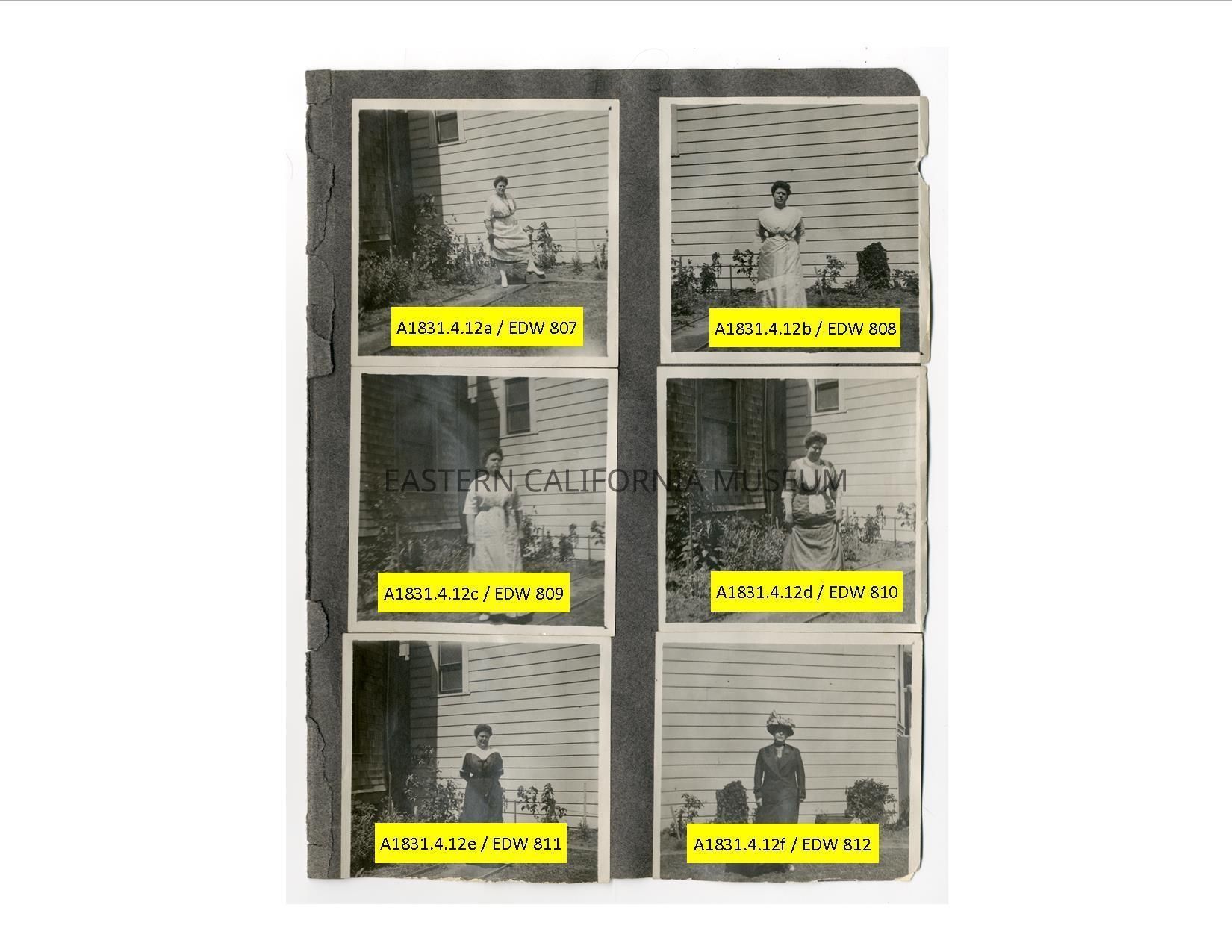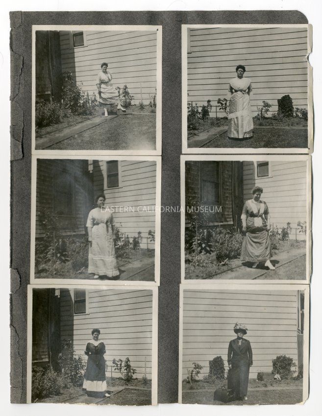 The photos on this album page appear to all be of Dora Shepherd modeling different dresses, shoes, and outfits. The location may be the house on 9th Avenue in San Francisco (house with shingle siding).