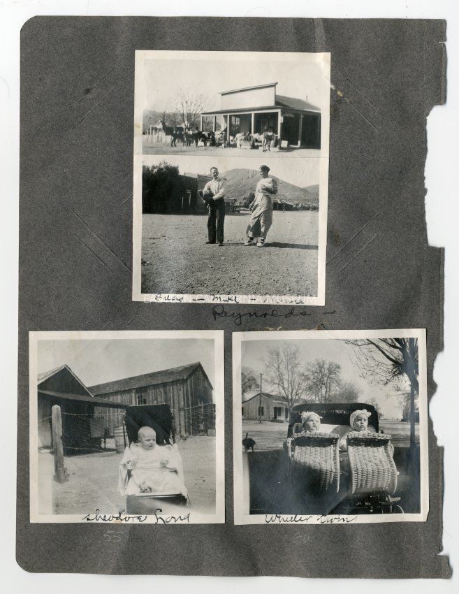 A1831.4.23d: Exterior photo of two babies in a double carriage or pram. They are parked along a dirt street and there are a few buildings in teh background. They are identified as the Wheeler twins.Collection
