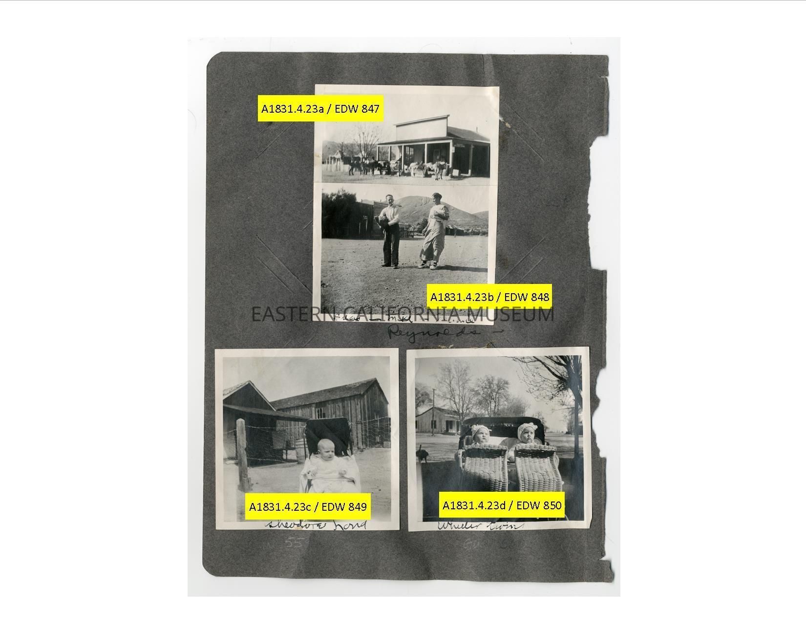 A1831.4.23c: Exterior photo of a baby in a carriage or pram. He is identified as Theodore Long. There are a couple rough wood buildings in the background.