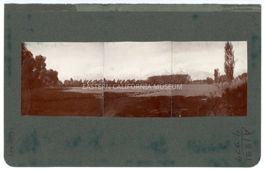 The three photos on this album page were taken to create a panorama view looking west toward the Sierra Nevada mountain range. Field, orchard in foreground. Location might be Shepherd's Ranch near Georges Creek.