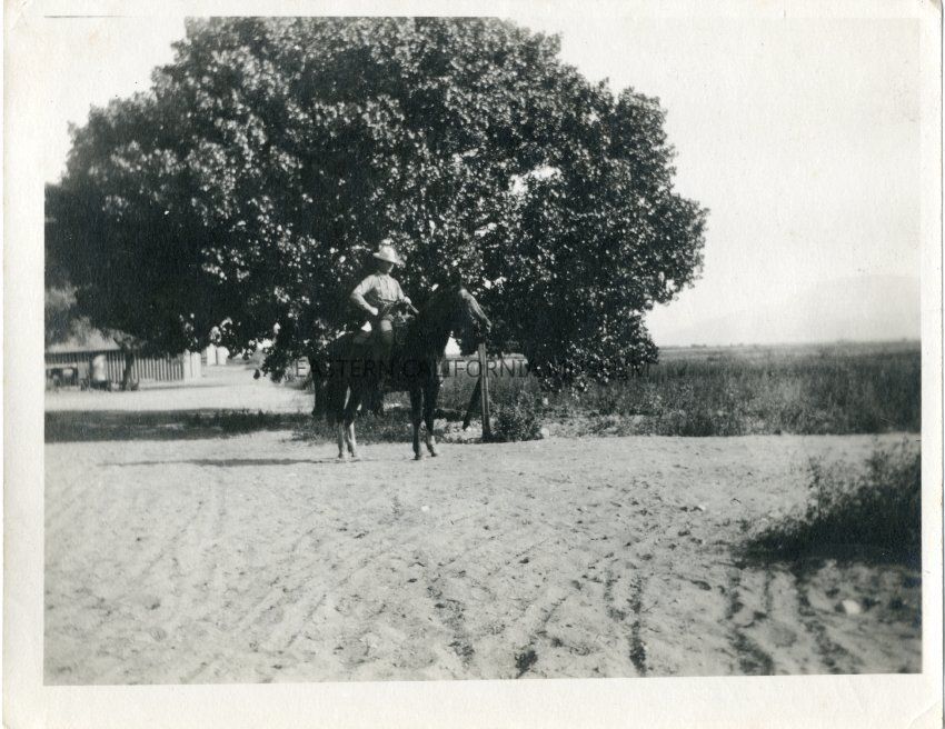 Photo of R. E. Robson on horseback at Manzanar, about 1913. Written in blue ink on reverse: R. E. Robson on horse, Manzanar, Calif., about 1913.