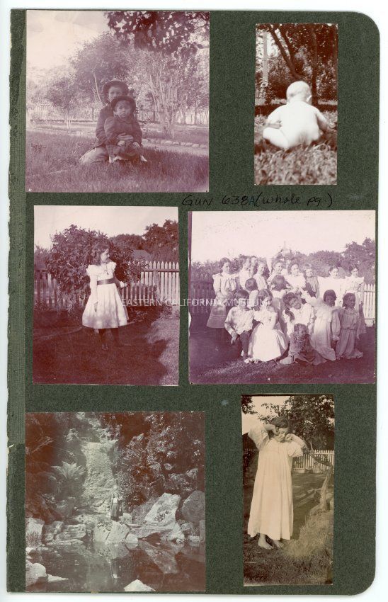 A1831.5.6d: Exterior photo of a large group of children on a grassy lawn with a white picket fence in the background. Most are girls wearing white dresses. Maybe the occasion is one of Helen Gunn's birthday parties?