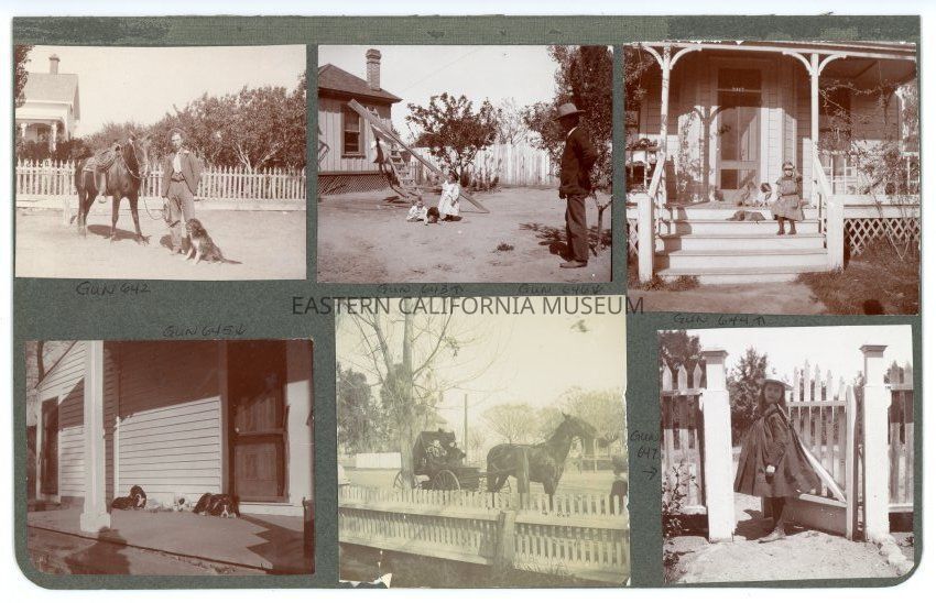 A1831.5.10a: Exterior photo of a man holding the lead to a saddled horse. There is a dog at his feet and a white picket fence, orchard, and partial view of a house behind him. The location is identified as Shepherd's Ranch near Georges Creek.
