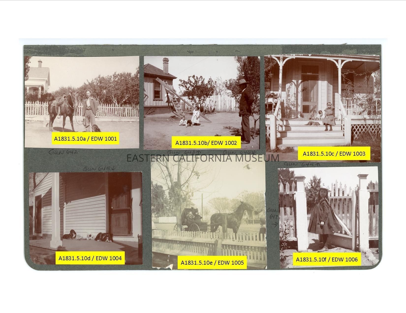 A1831.5.10b: Exterior photo of a man, two small children, and a dog outside in a dirt yard. There is a house and ladder in the background.