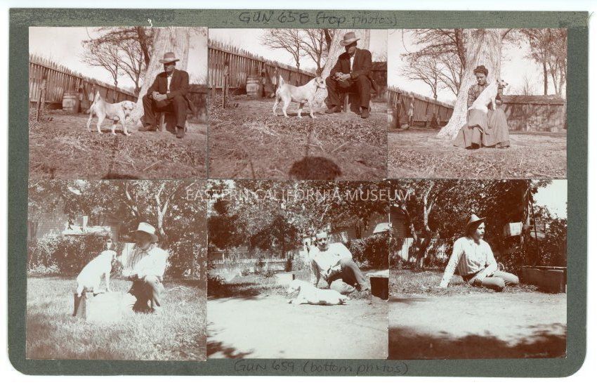A1831.5.16d: Exterior photo of a man kneeling on a grassy lawn next to a dog sitting on a box (learning tricks?). Location is likely the Edwards House in Independence.