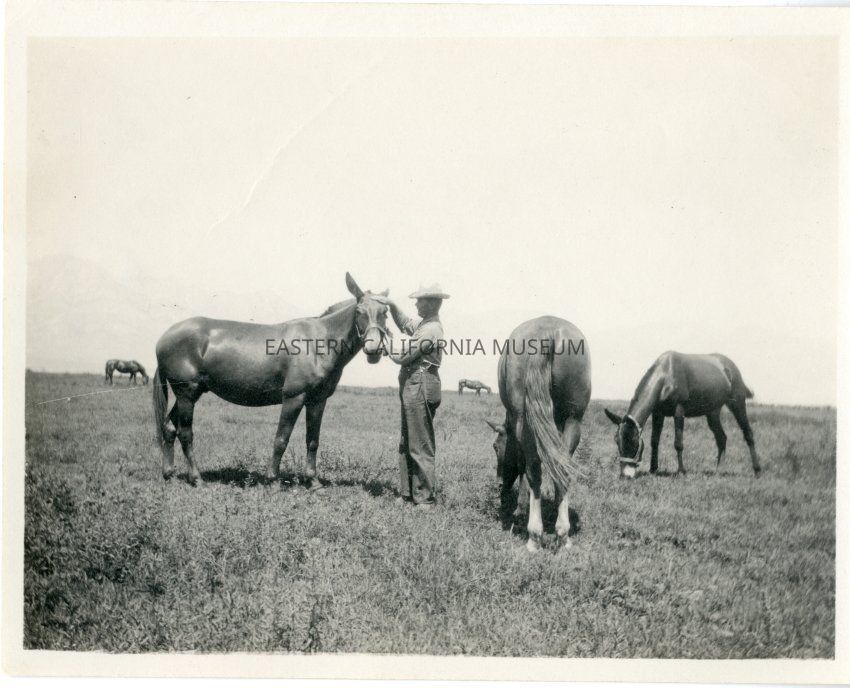 Photo of R. E. Robson on Shepherd Ranch near Manzanar petting a horse. There are four other horses in the picture.