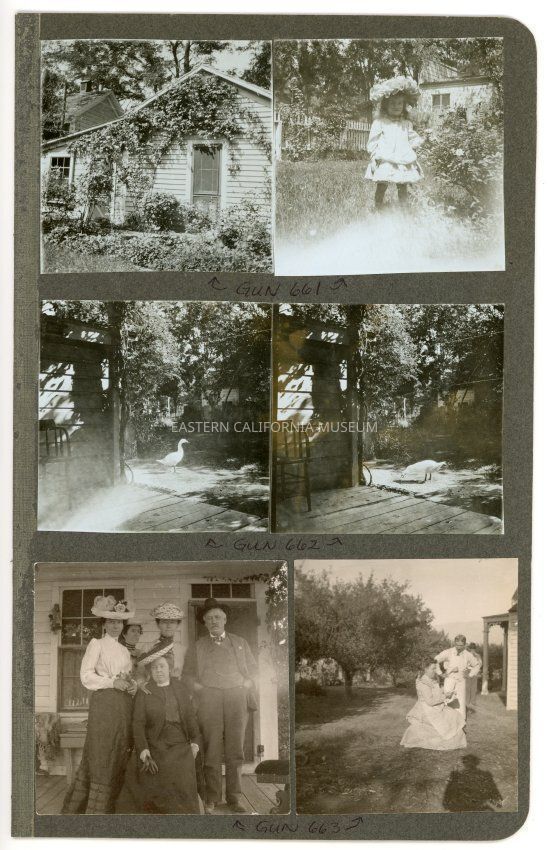 A1831.5.18f: Exterior photo of three people in front of a house and orchard. They are likely members of the Shepherd family and the location may be Shepherd's Ranch near Georges Creek.Collection