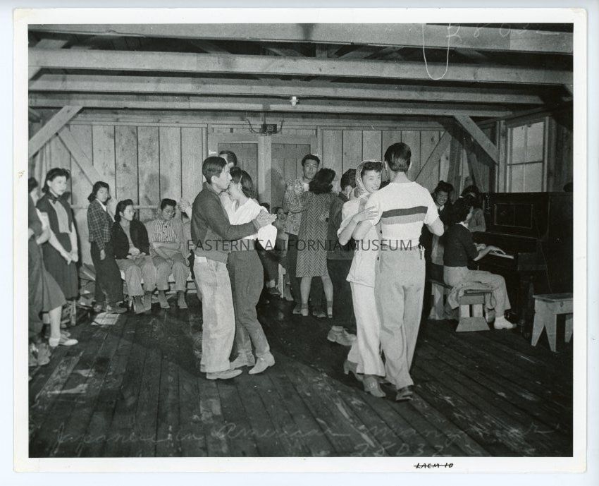 Photo of a barrack interior with several couples dancing. A woman is playing the piano in the back right. Faint writing on the front says, "Japanese American Manzanar 28032."