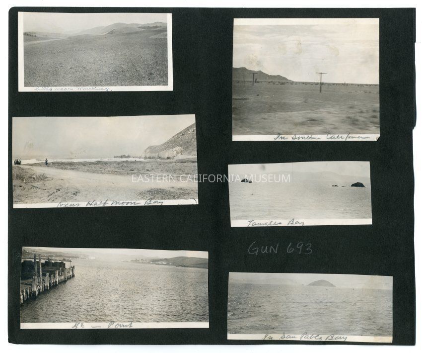 A1831.6.24b: Photo of the seashore. There is a dirt road and some people on the left side. It is labeled, "Near Half Moon Bay."