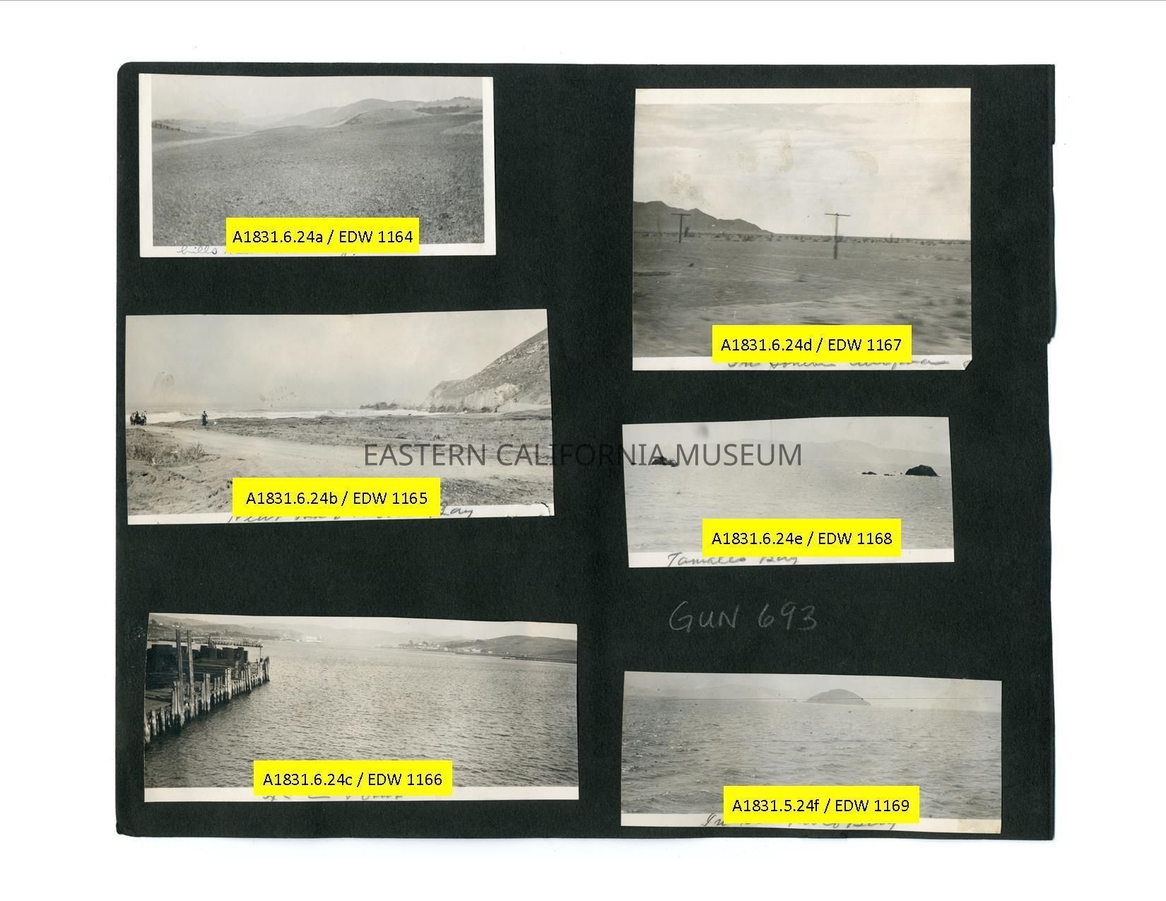 A1831.6.24e: Photo of the ocean with some rocks. Mountains are visible across the other side. It is labeled, "Tomales Bay."