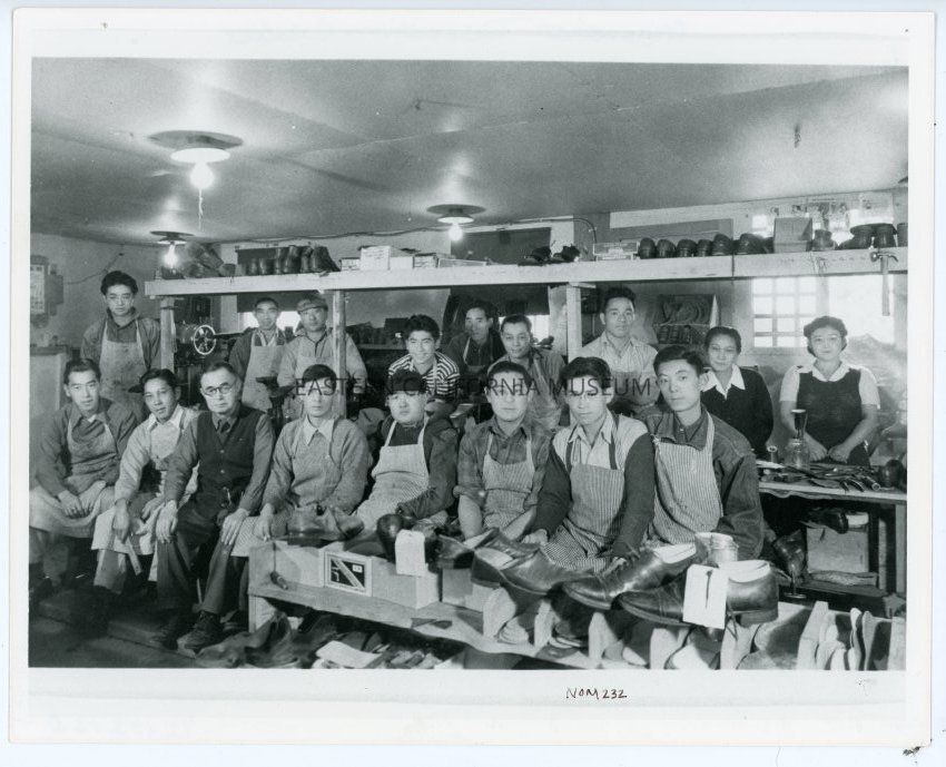 Large group of men and a couple women inside a shoe repair business at Manzanar War Relocation Center. Hachizo Nomura, Manager of the Manzanar shoe repair shop, is in this photo. A yellow sticky note had indicated which person was Hachizo Nomura, the manager of the Manzanar shoe repair shop, but it had become detached. Hachizo may be the third person from left.