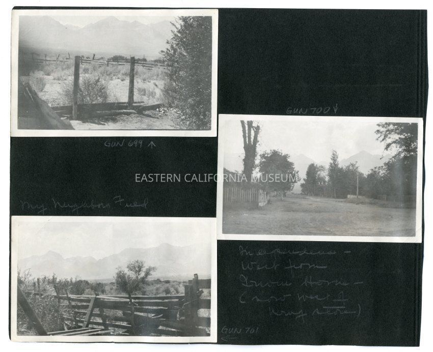 A1831.6.30a: Photo taken looking west toward the Sierra Nevada mountain range, likely from Independence. There are some old fences (corrals?) in the foreground.