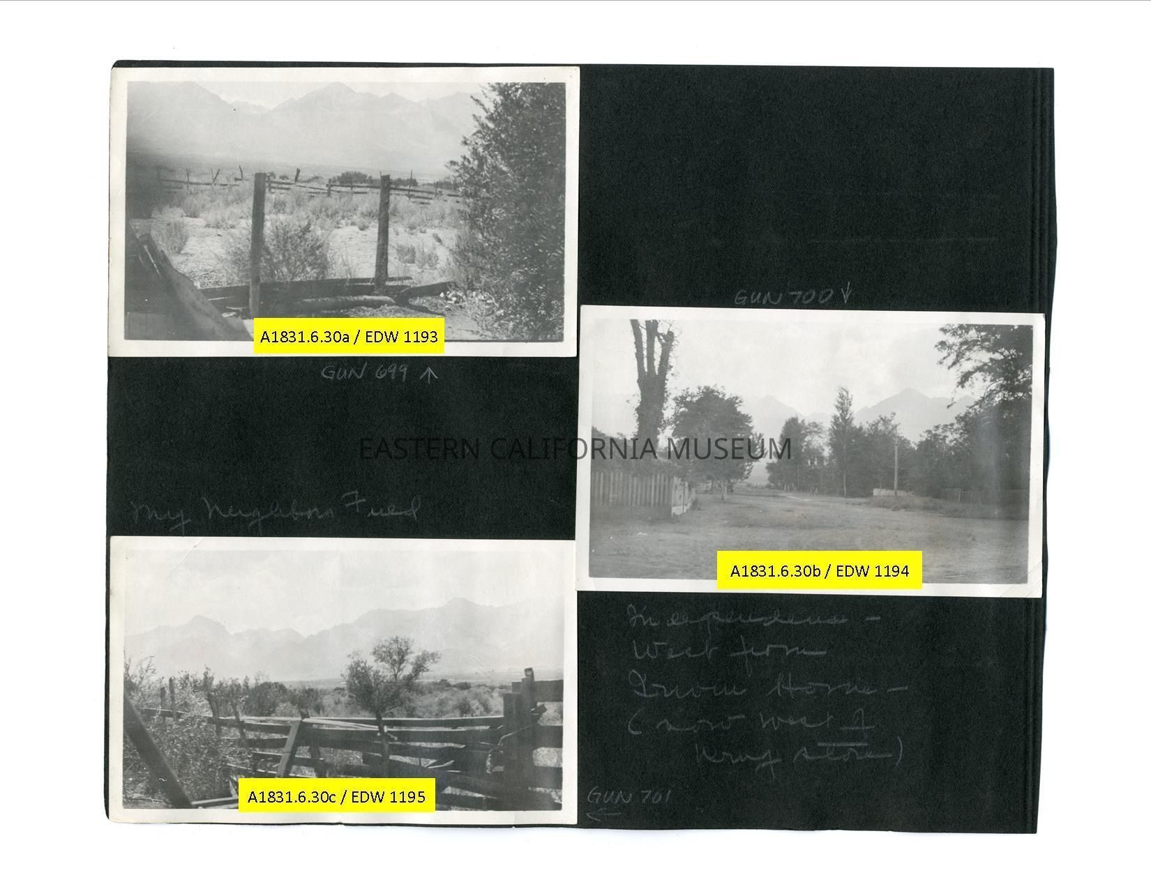 A1831.6.30c: Photo of a fence in the foreground and mountains in the background. It is labeled, "My neighbor's field."Collection