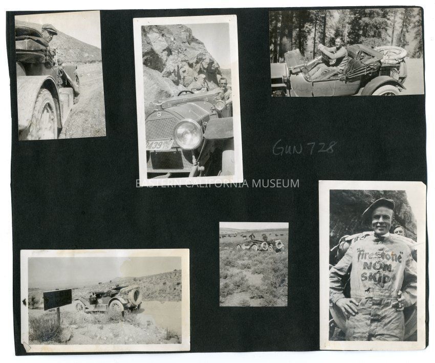 A1831.6.52d: Photo of an early vehicle parked on a dirt road in a desert landscape next to a sign that says, "Slow Danger." The door is open.