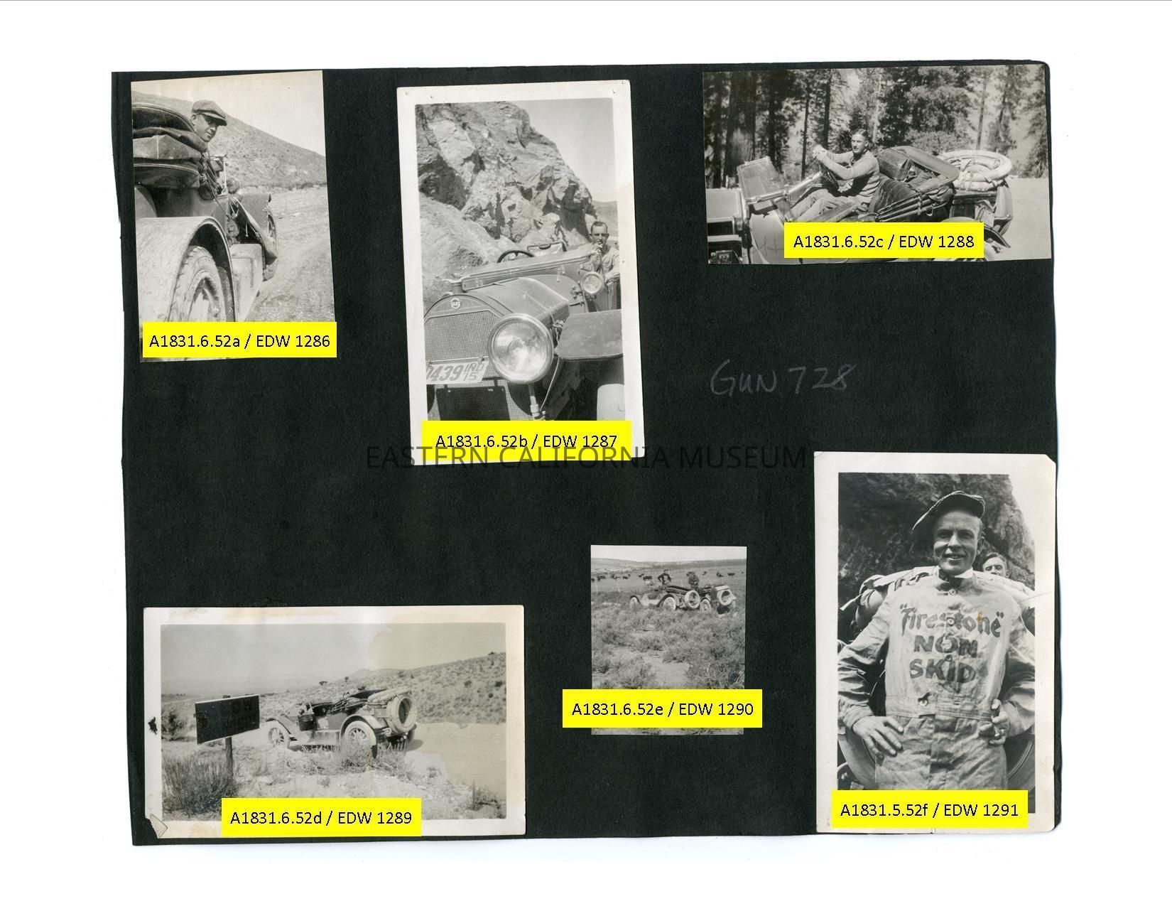A1831.6.52b: Photo of a man sitting in an early vehicle. There is a rocky hillside in the background.