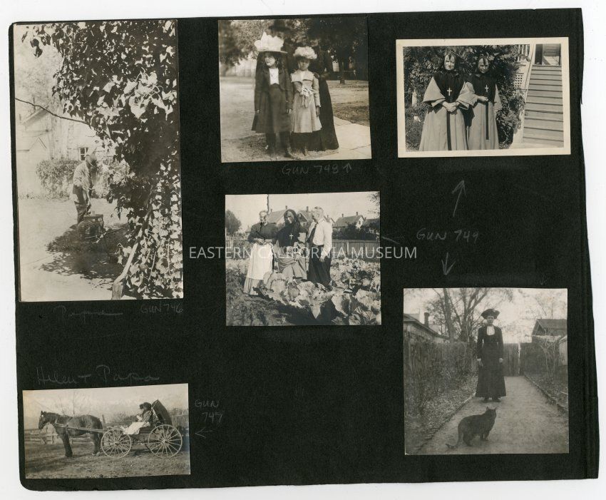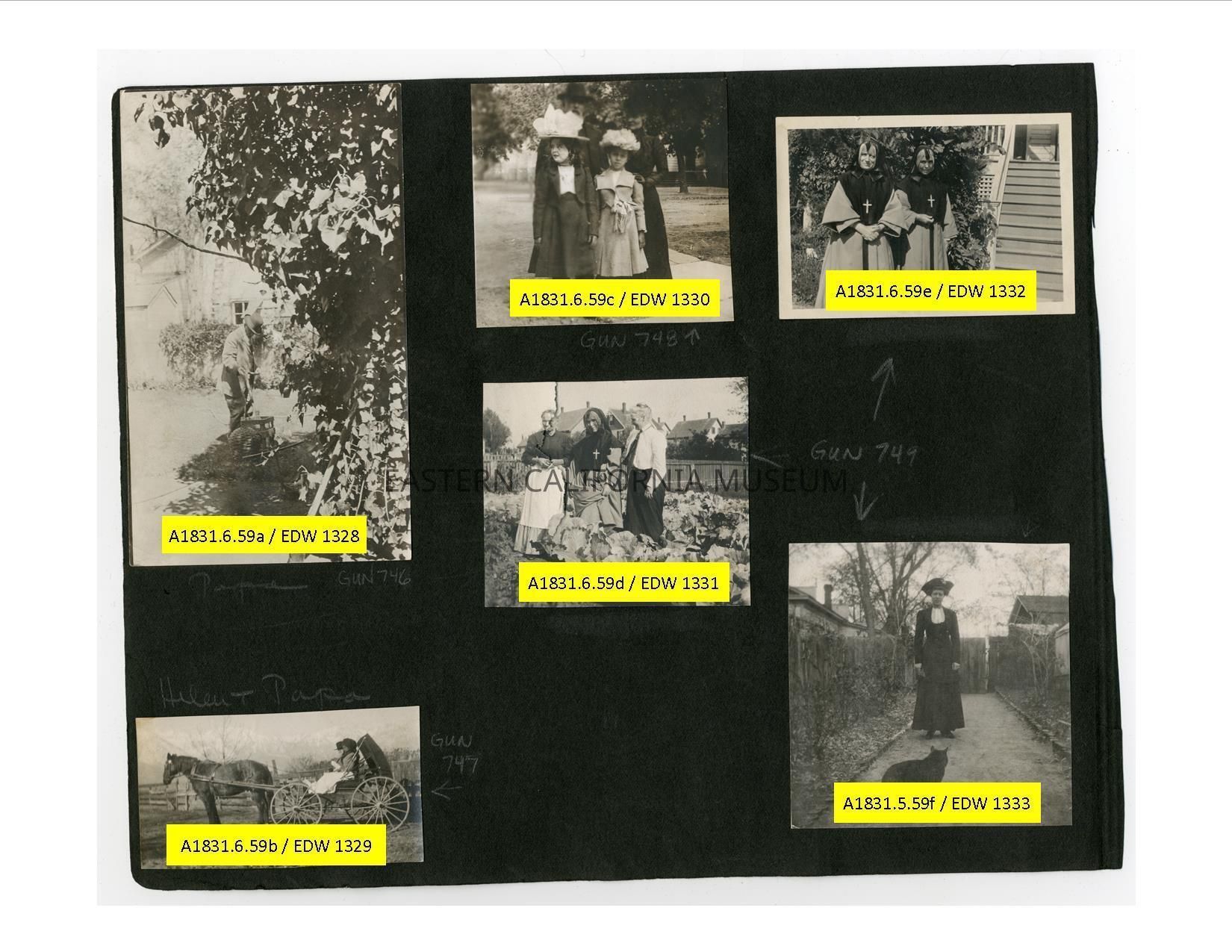 A1831.6.59b: Photo of a man and woman sitting in a horse drawn buggy. Written on album page above is, "Helen [Gunn] and Papa [Jack Gunn]."