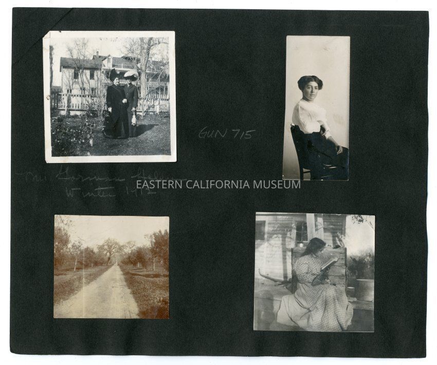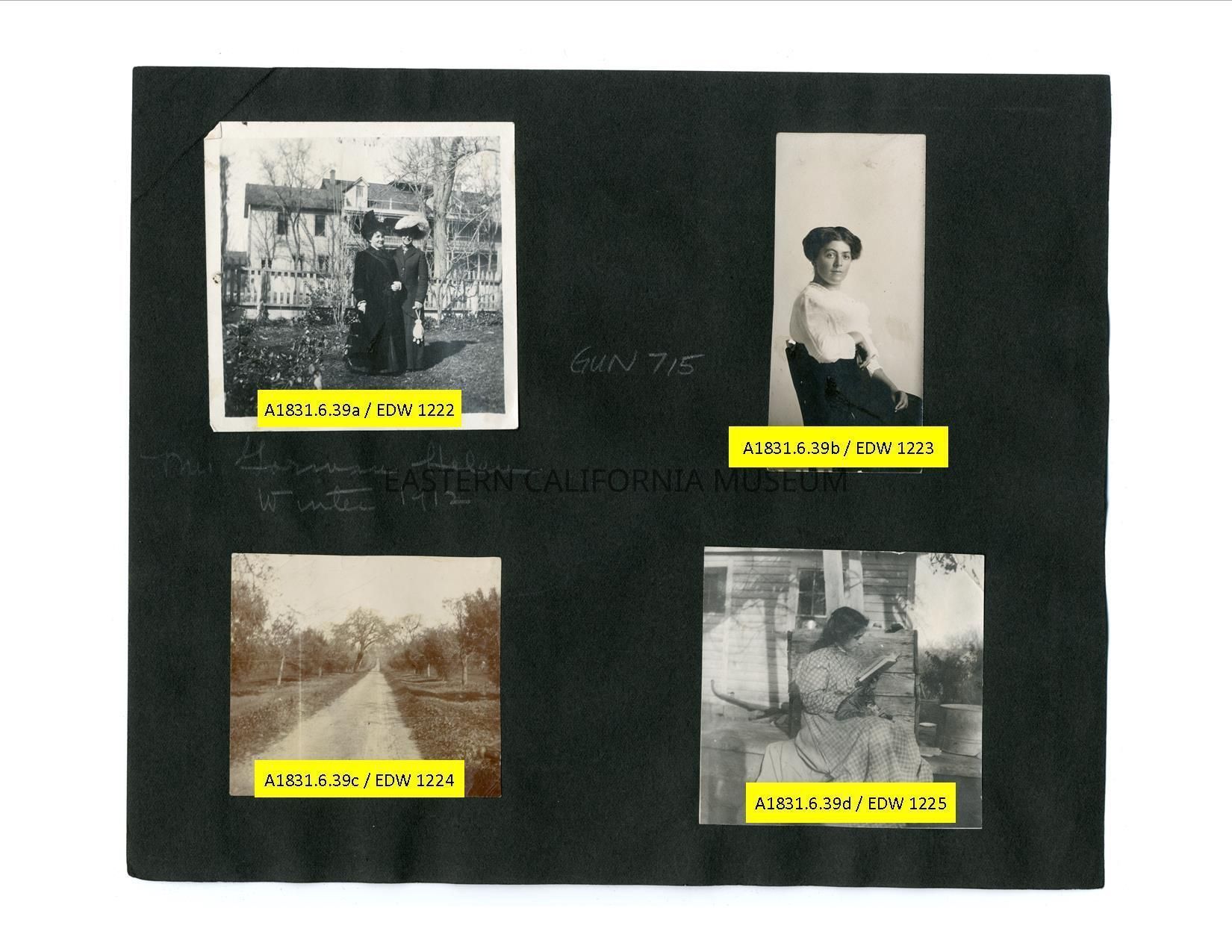 A1831.6.39a: Photo of two women standing in the yard of the Edwards house with the Norman House (hotel) visible in the background. They are identified as Mrs. Gorman and Helen Gunn in the winter of 1912.
