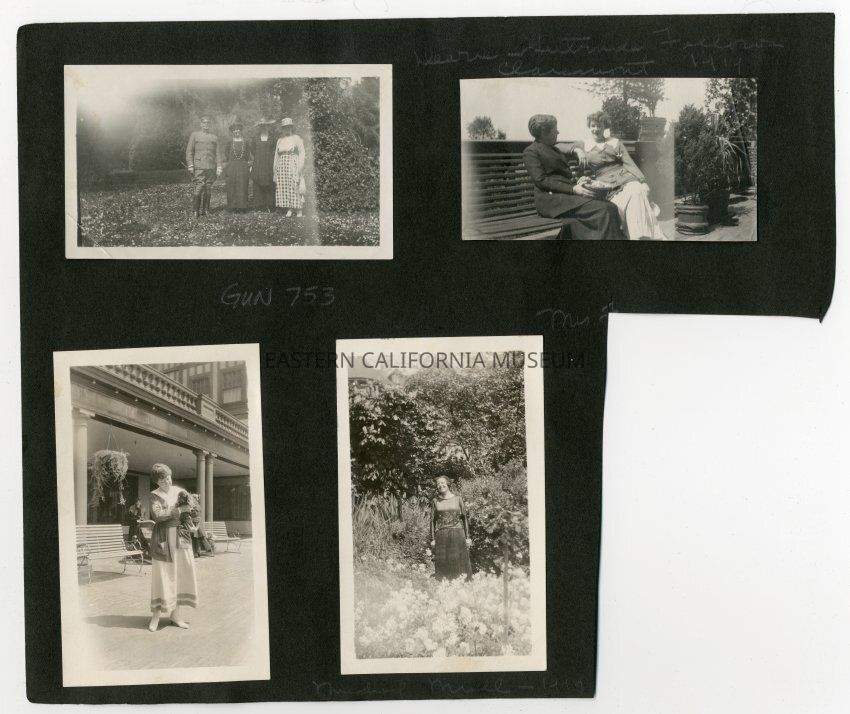 A1831.6.63b: Photo of two women sitting on a bench. Written on album page above is, "Dearie (?) adn Gertrude Fellows, Claremont, 1919."