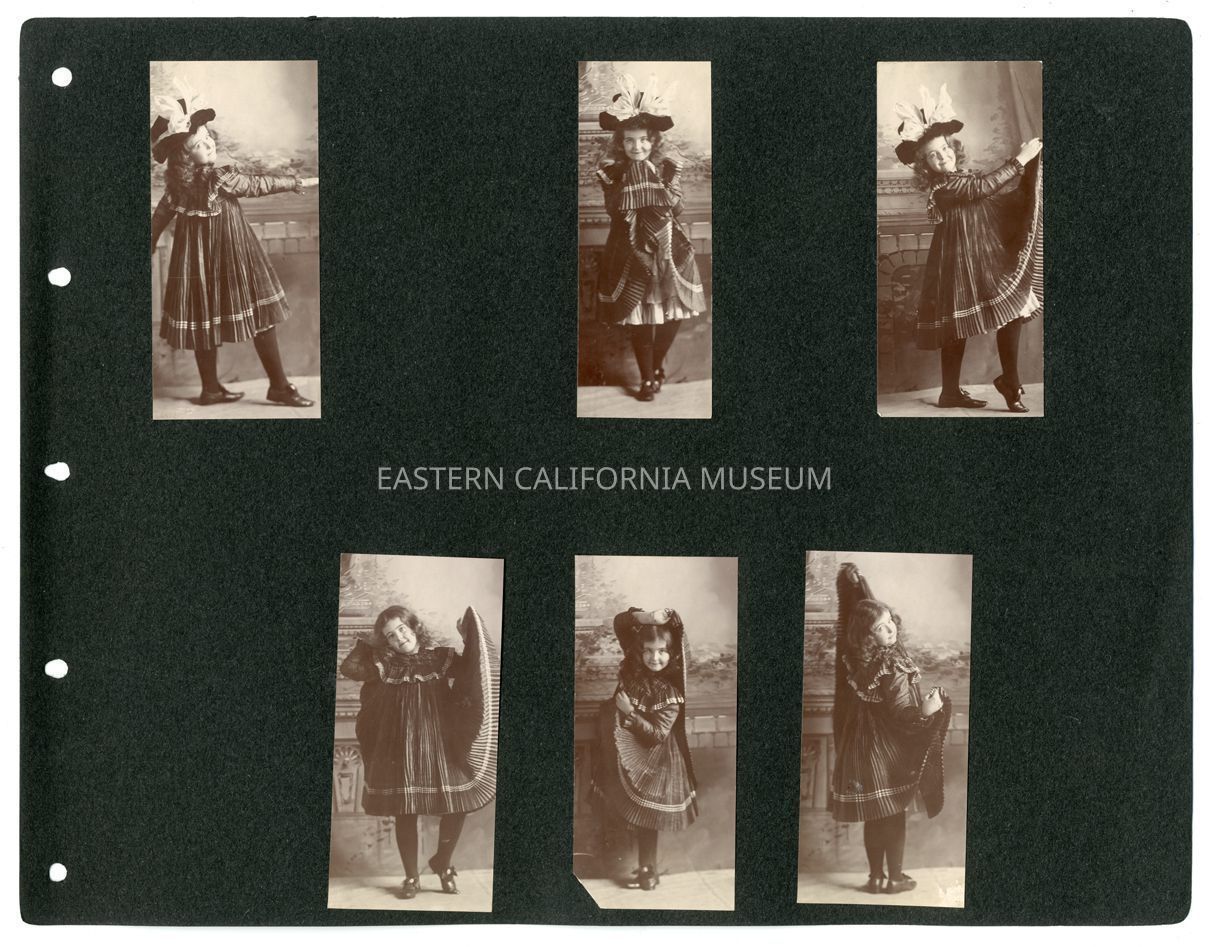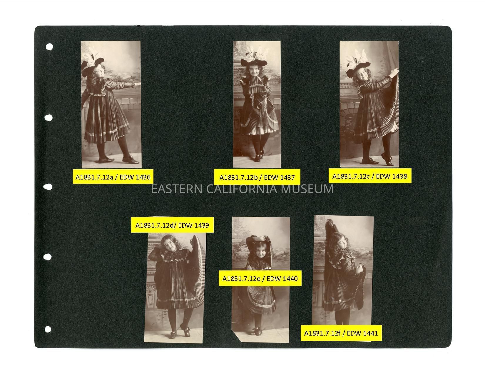 All six photos on this album page are studio portraits of Helen Gunn as a young girl modeling a pleated dress.