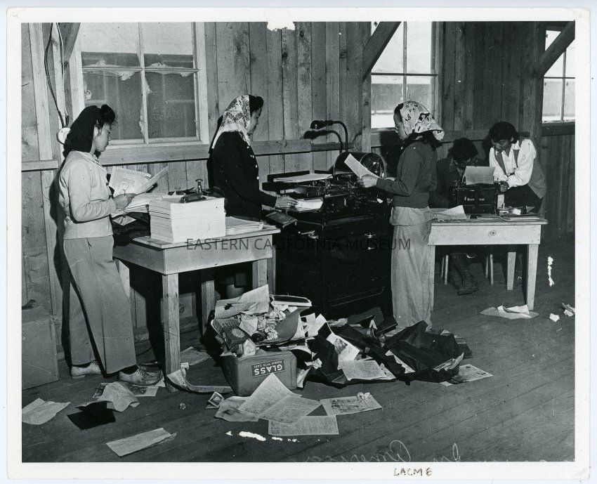 Photo of the interior of the Manzanar Free Press office with five women working.