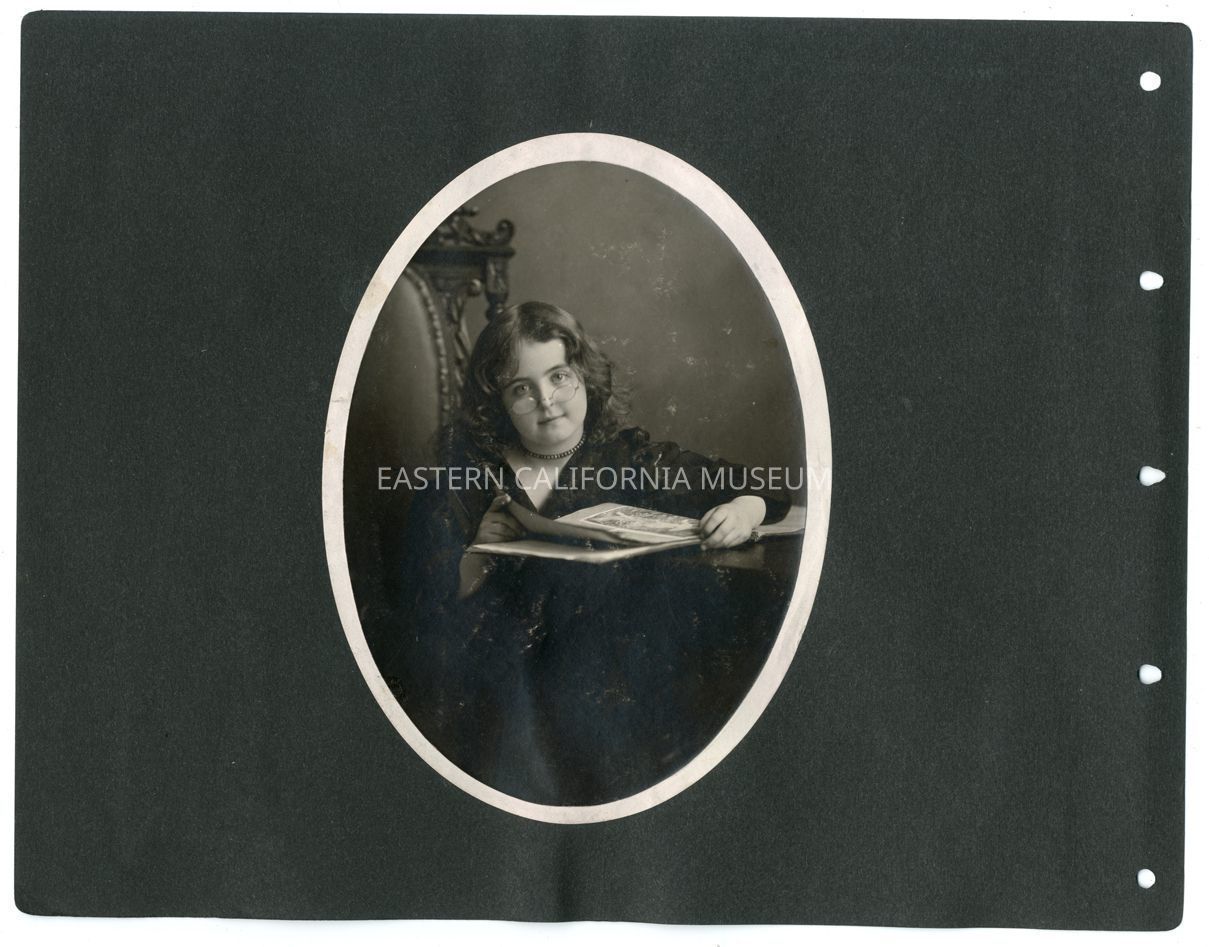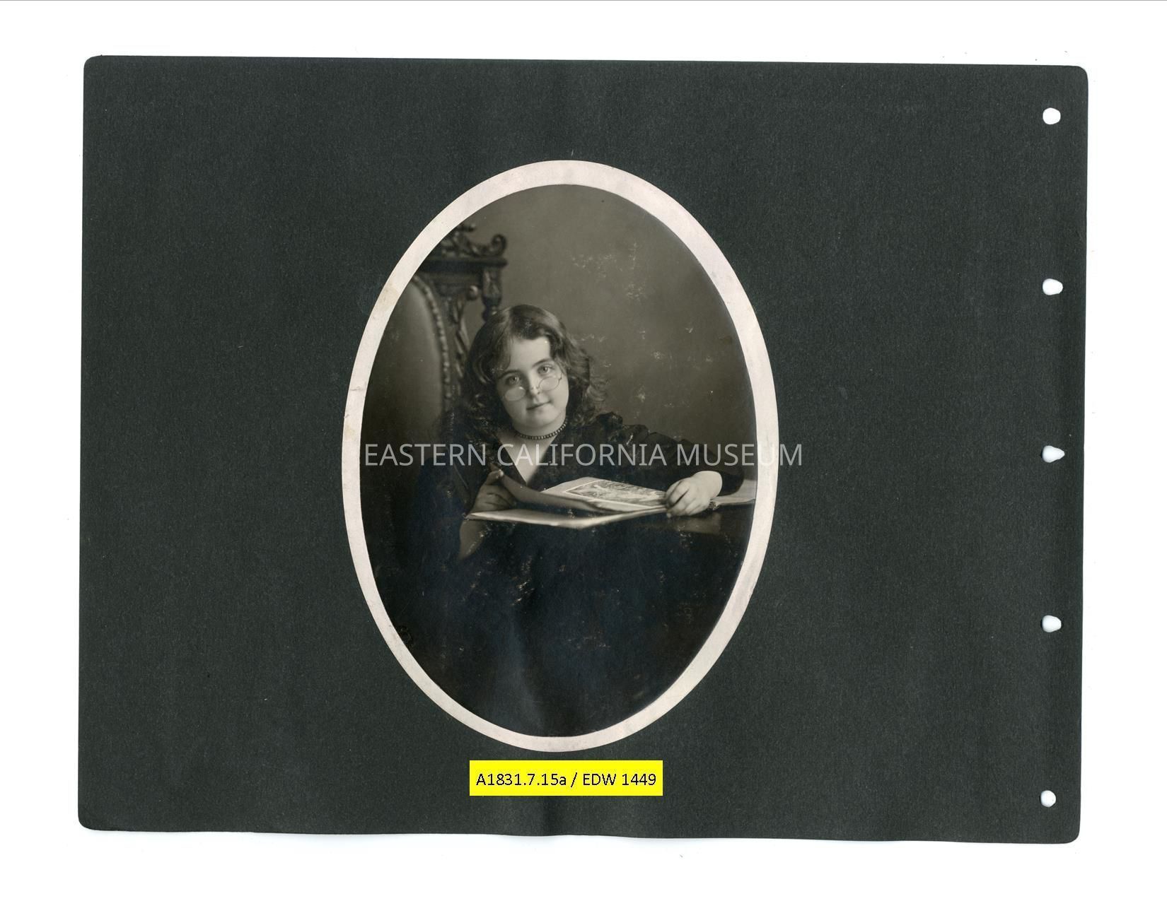 A1831.7.15a: Studio portrait of Helen Gunn wearing glasses and posing with an open book.