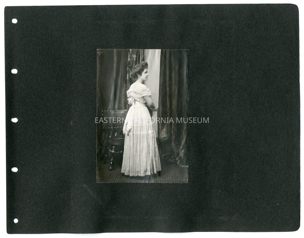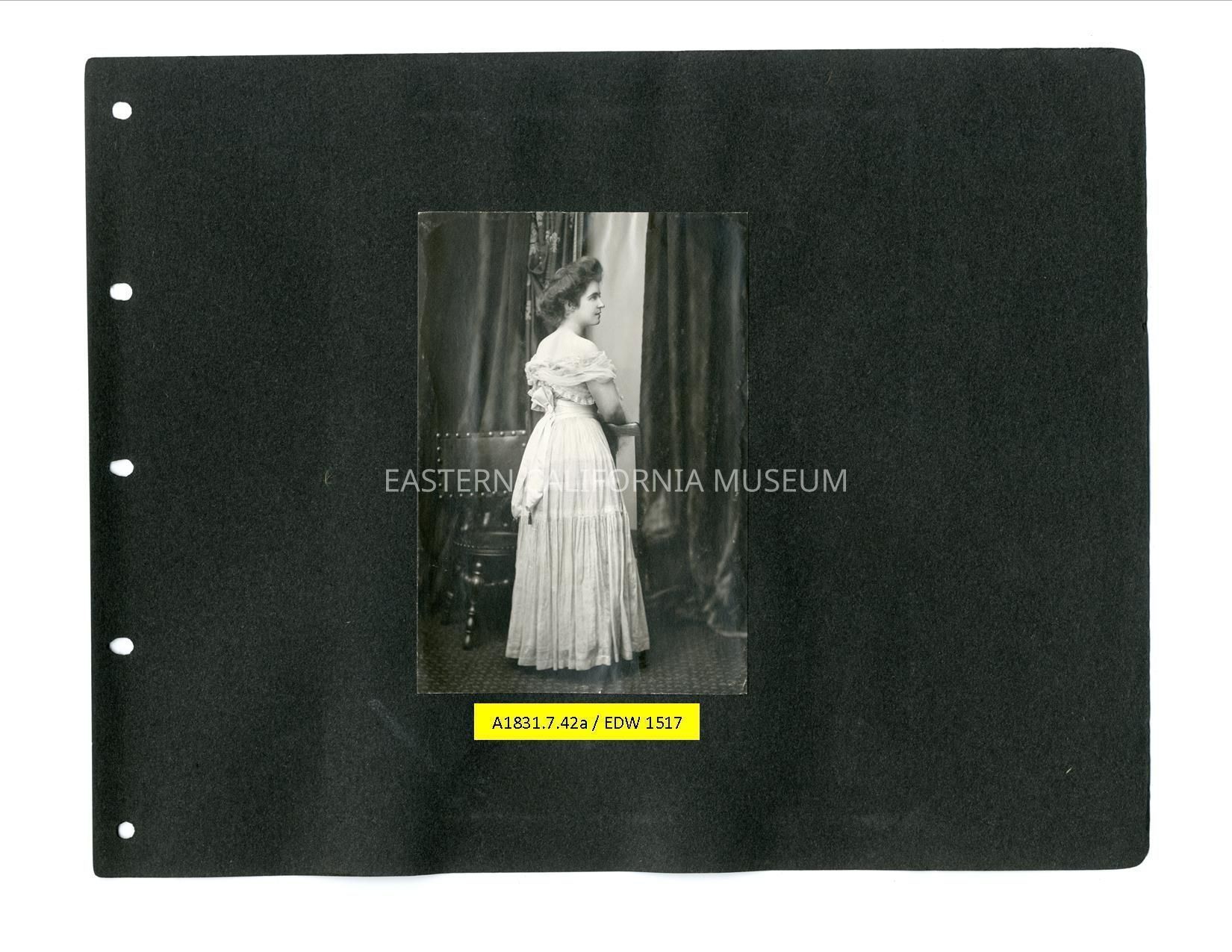 A1831.7.42a: Studio portrait of Helen Gunn with her back turned to the camera. She is wearing a white off-the-shoulder dress.