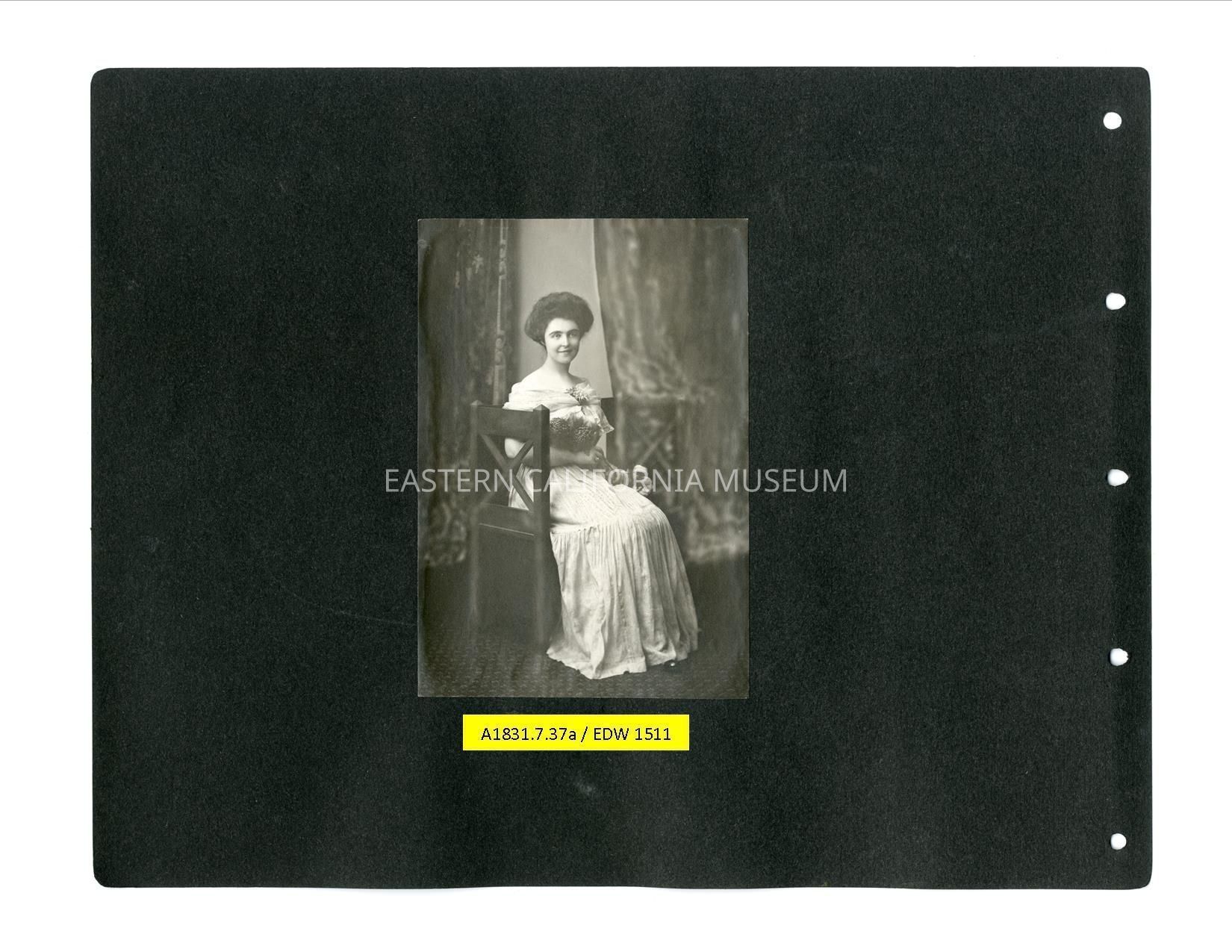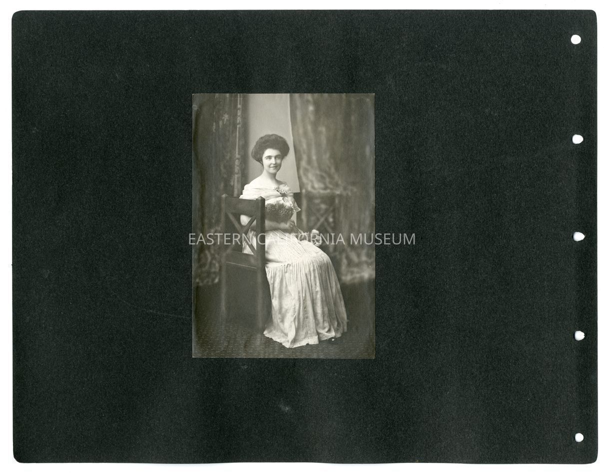 A1831.7.37a: Studio portrait of Helen Gunn sitting in a chair. She has several large flowers in her arms is is wearing an off-the-shoulder dress.Collection