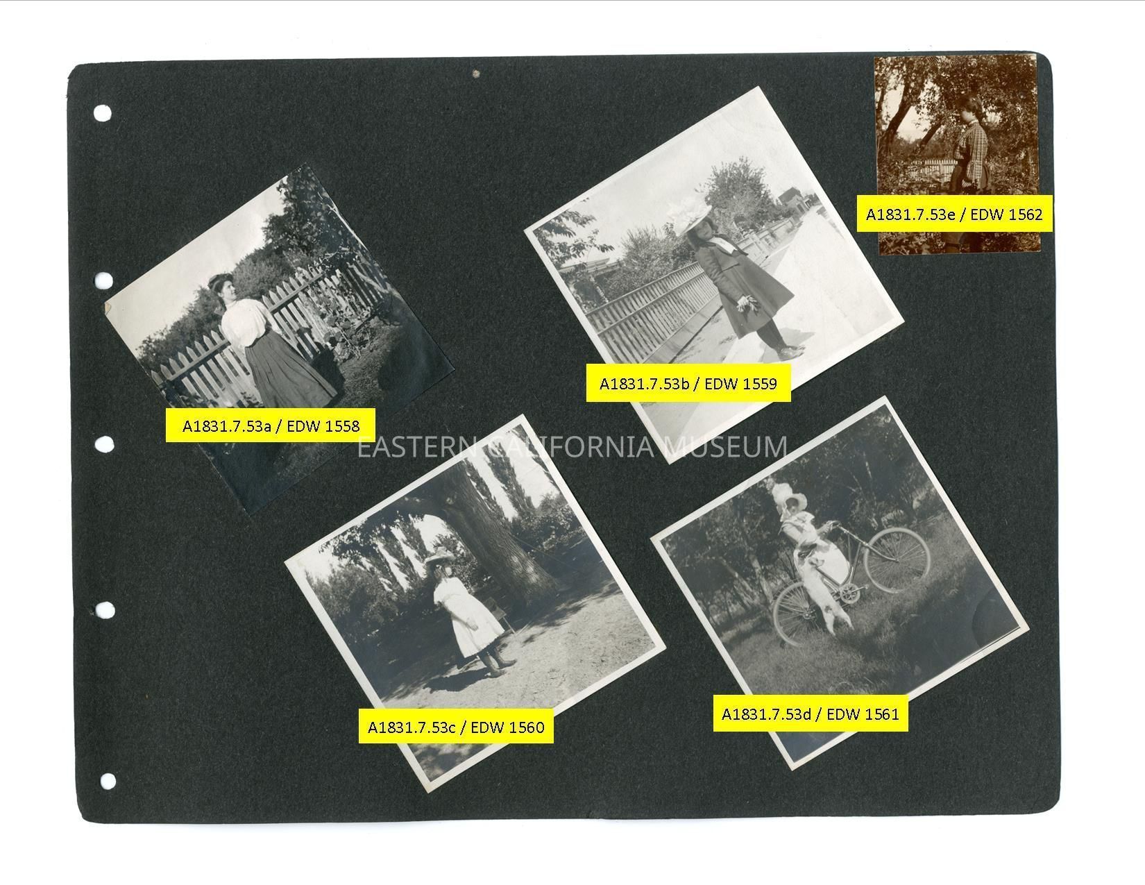 A1831.7.53a: Exterior photo of a young woman (Helen Gunn?) standing by a picket fence.