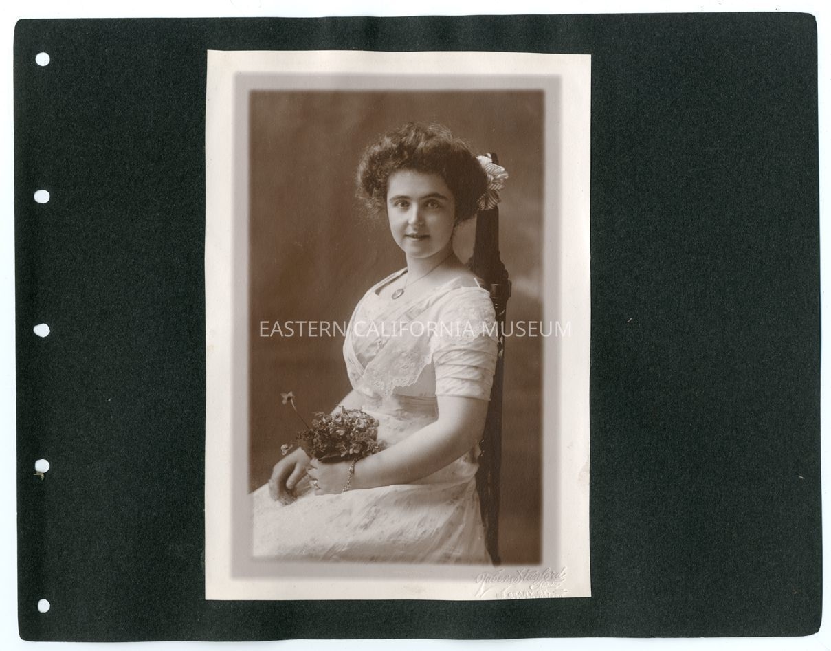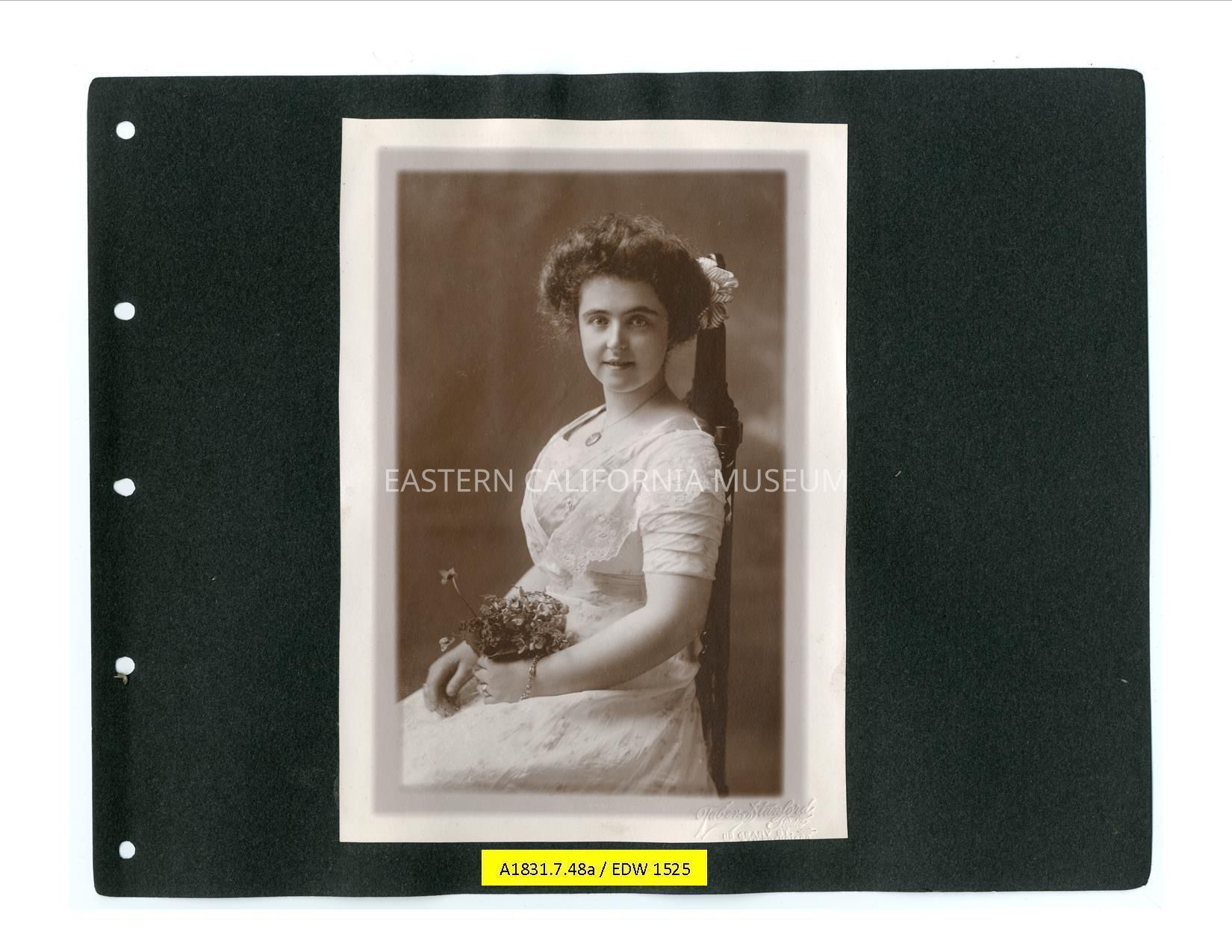 A1831.7.48a: Studio portrait of Helen Gunn sitting in a chair. She is wearing a white dress with short sleeves and holding a bouquet of flowers. She is wearing a ring on the ring finger of her left hand--possibly an engagement or wedding photo?Collection