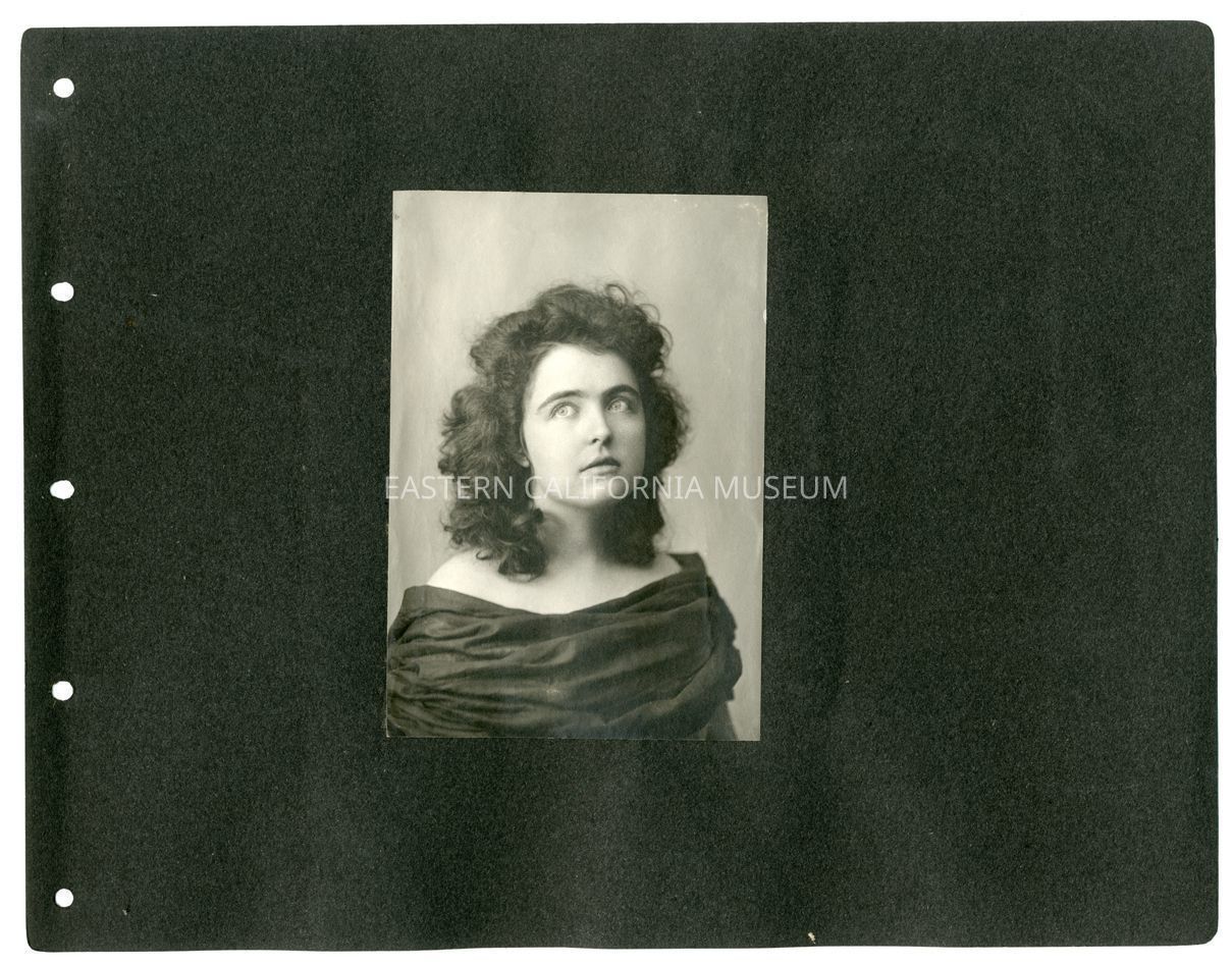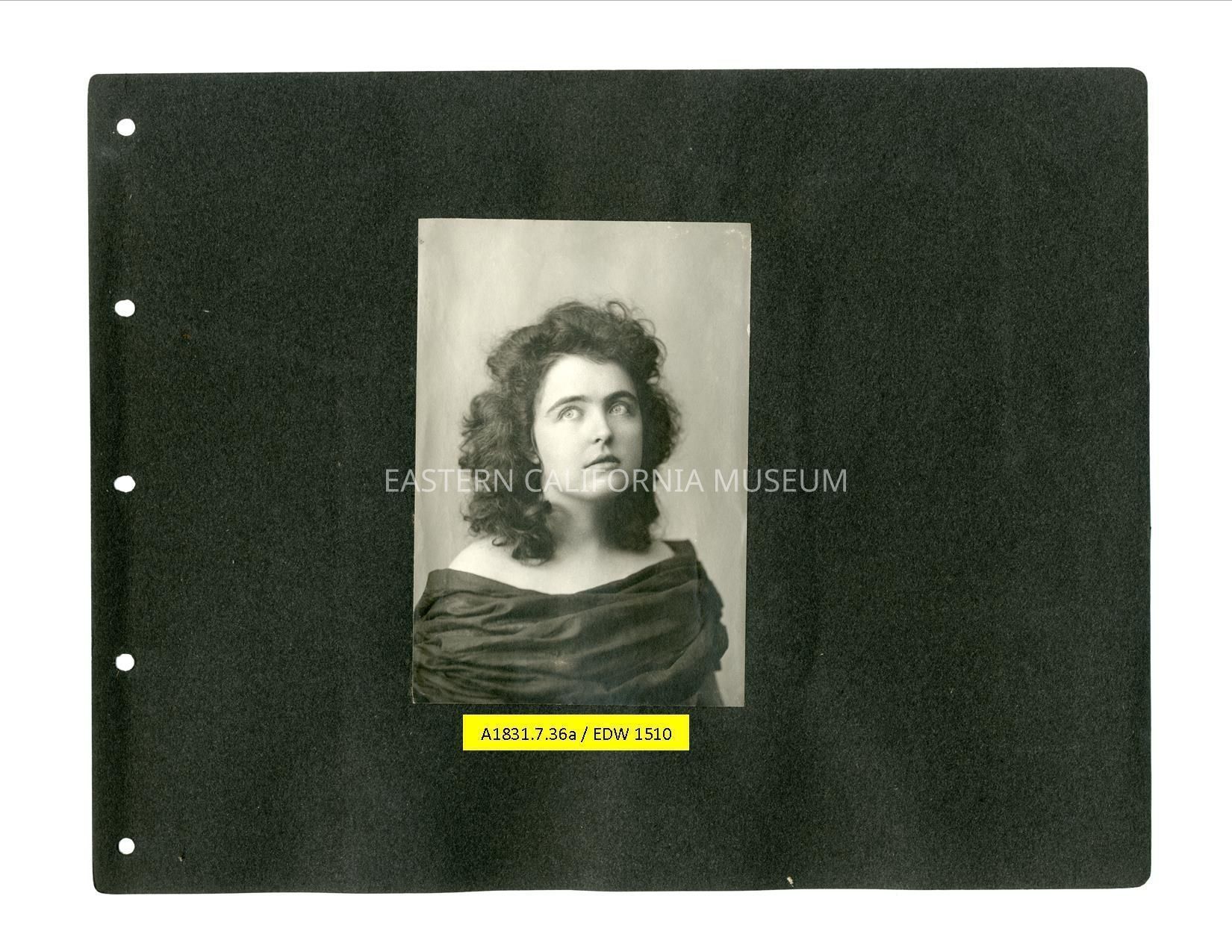 A1831.7.36a: Studio portrait of Helen Gunn. Her hair is down and wild, and she is wearing a black off-the-shoulder wrap.
