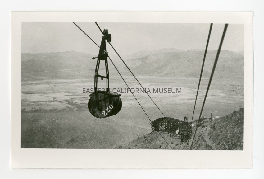 Photo taken looking down the cables of the Saline Valley Salt Co. aerial tramway at bucket #220. One of the stations is visible in the background perched on the side of the mountain. Saline Valley visible in the distance.Collection