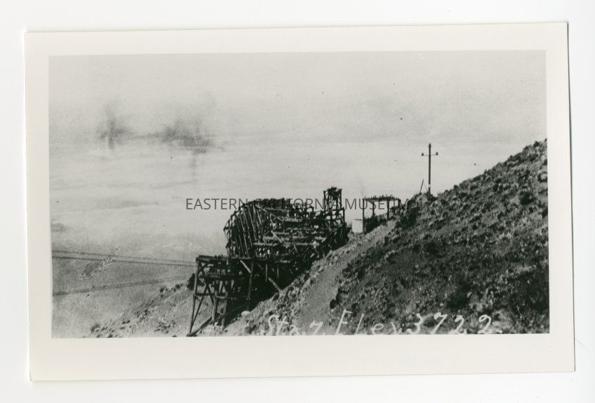 Photo of one of the stations of the Saline Valley Salt Co. aerial tramway. The caption says, "Sta. 7, Elev. 3,722."Collection