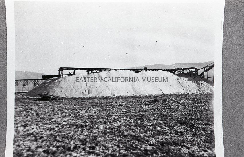 Photo of a huge pile of salt that all but blocks the station or equipment behind it. Produced by the Saline Valley Salt Co.Collection