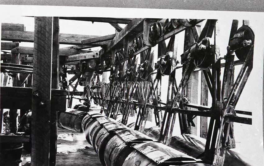 Photo of the terminus of the Saline Valley Salt Co. aerial tramway. Several salt buckets are lined up.Collection