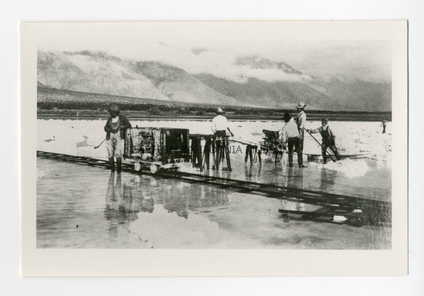 Photo of several Saline Valley Salt Co. laborers working to load a salt cart (on tracks). They are using a wheelbarrow on a ramp to load the large salt cart.Collection