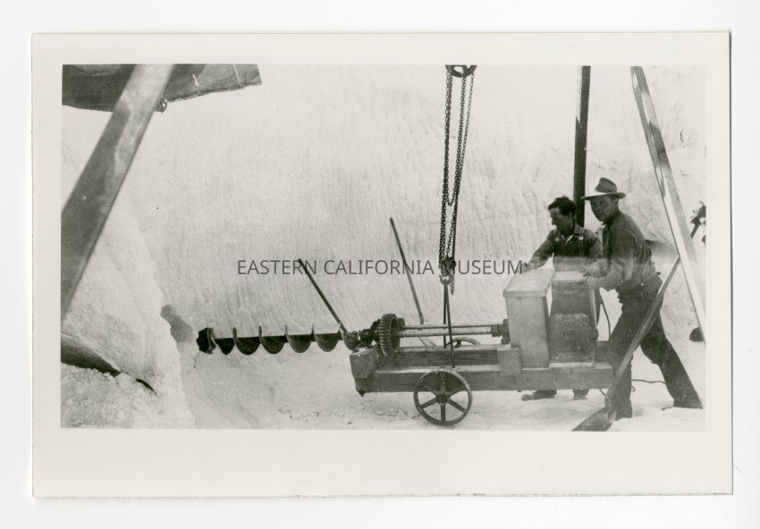 Photo of two men operating a huge drill to bore holes into what appears to be a wall of salt.Collection