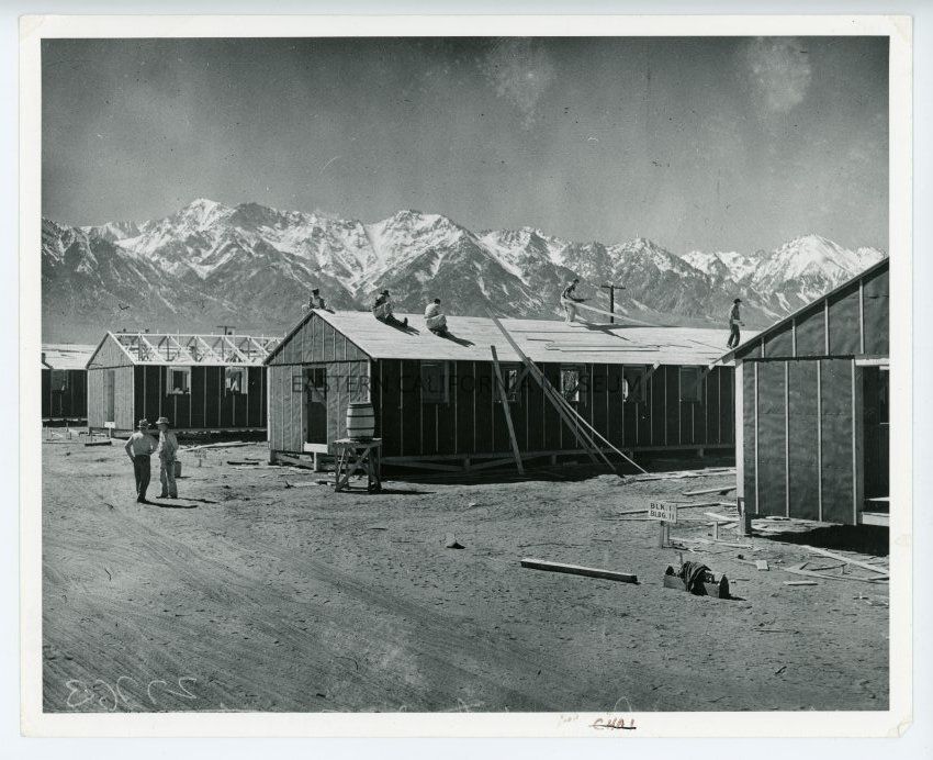 Photo of a street at Manzanar War Relocation Center with barracks under construction. Several men are working on the roof. Area is block 1, building 11. Snow-covered Sierra Nevada in background.