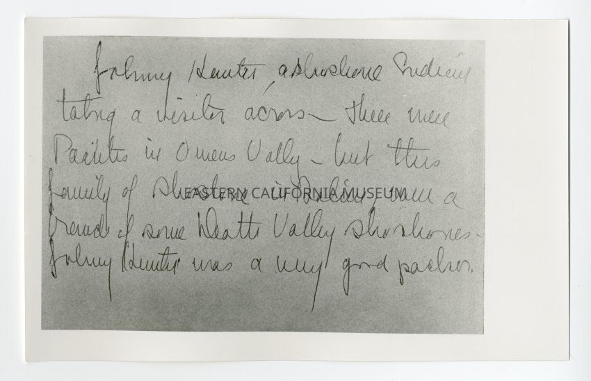 Photo of a caption or label, likely from the album the original photos were in. It says, "Johnny Hunter, a Shoshone Indian, taking a visitor across. There were Paiutes in Owens Valley, but this family of Shoshone in Saline were a band [?] of some Death Valley Shoshones. Johnny Hunter was a very good packer." This caption may be in reference to photo 1981.53.70.Collection