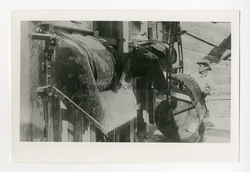 Photo of a man loading salt buckets to be sent along the aerial tramway of the Saline Valley Salt Co.Collection