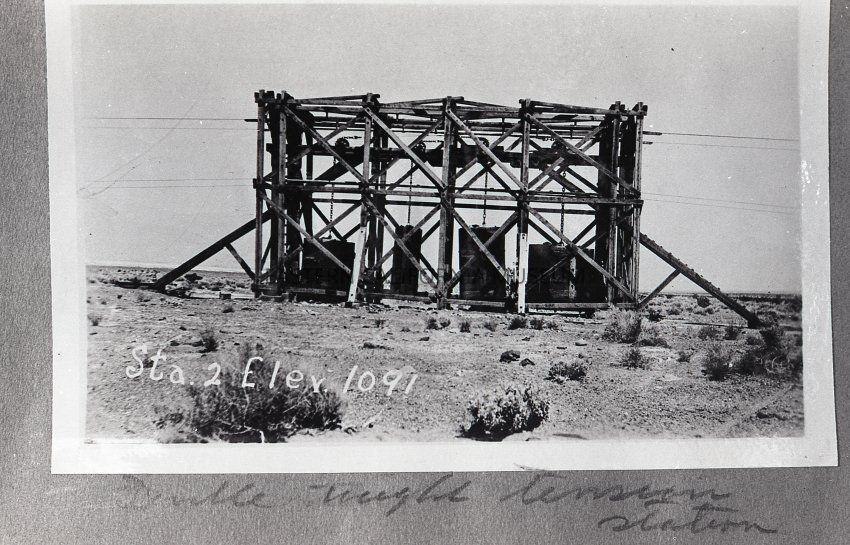 Photo of a tension station along the Saline Valley Salt Co. aerial tramway. The caption says, "Sta. 2, Elev. 1,091."