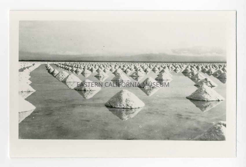 Photo of uniform mounds of salt in shallow water (evaporation pools?). Produced by the Saline Valley Salt Co.Collection