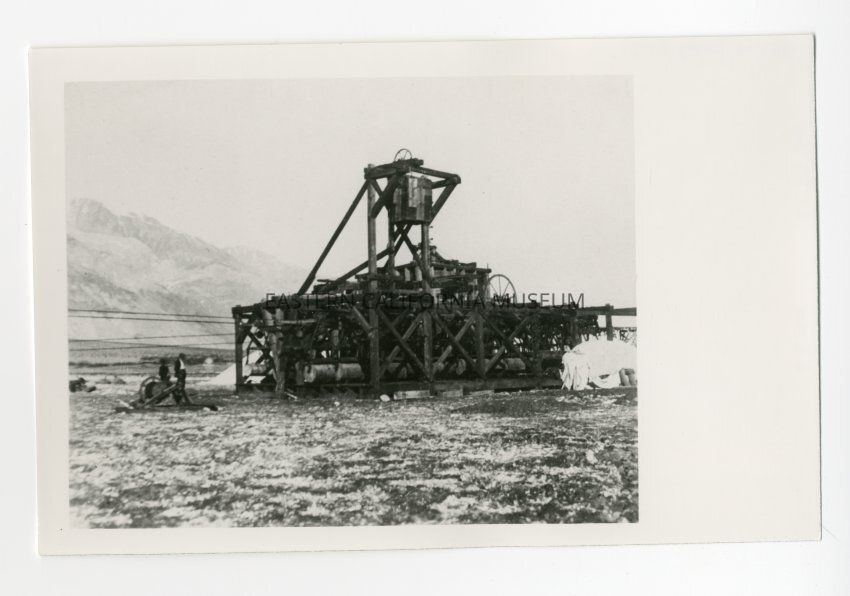 Photo of what may be the terminus of the Saline Valley Salt Co. aerial tramway. Note the salt buckets appear to make a U-turn here. Two people are standing to the left of the structure.Collection