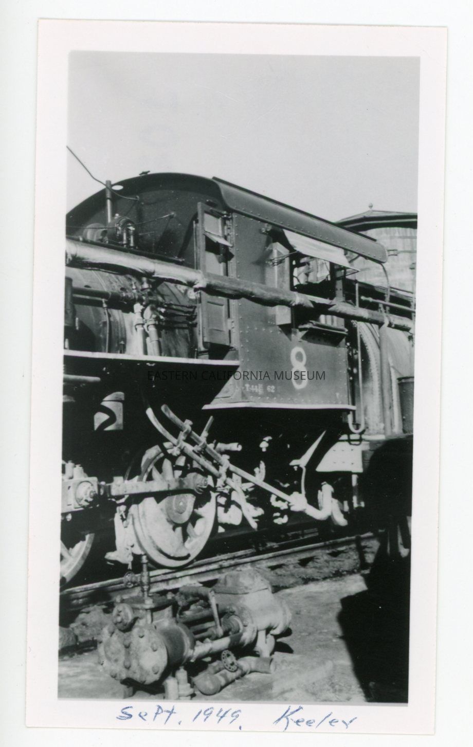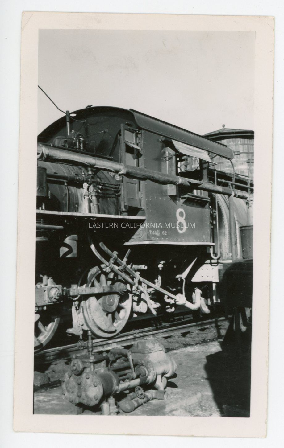 1972.80.2b--Photo of the cab of Southern Pacific engine #8. There appears to be a water tower in the background and some kind of machinery in the foreground. It is labeled on the front in blue ink "Sept. 1949 Keeler."