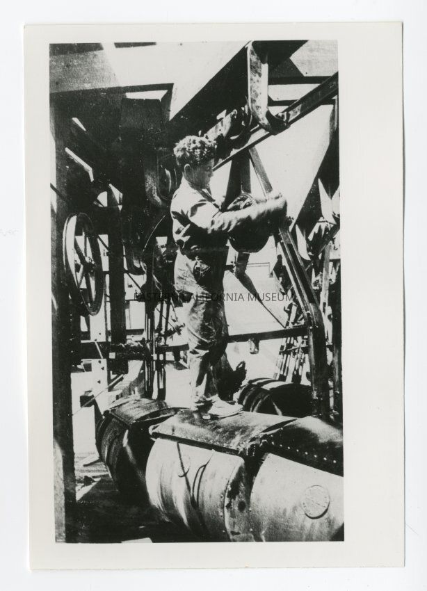 Photo of a man standing on a salt bucket and fiddling with the metal frame.Collection