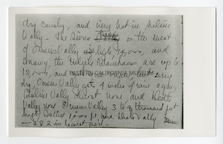 Photo of a page (#5) from a letter or memoir written March 14, 1970 by Margret Smith Wilson. It says, "...dry country, and very hot in Saline Valley. The Sierra range on the west of Owens Valley is high, 14,000, and snowy. The White Mountains are up to 12,000 and with some snow, but very dry. Owens Valley gets 4 inches of rain a year, Saline Valley almost none, and Death Valley none. Owens Valley 3 to 4 thousand feet high, Saline 1,000 feet, and Death Valley minus 282 in lowest part."Collection